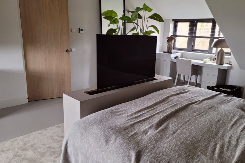 The options of our TV lifts are many, from pop-up to swivel and drop-down. Moreover, the cabinet, furniture or footboard can be finished according to your wishes. You can choose from every colour and material. The TV lift is a stylish interior solution, also for the business market.