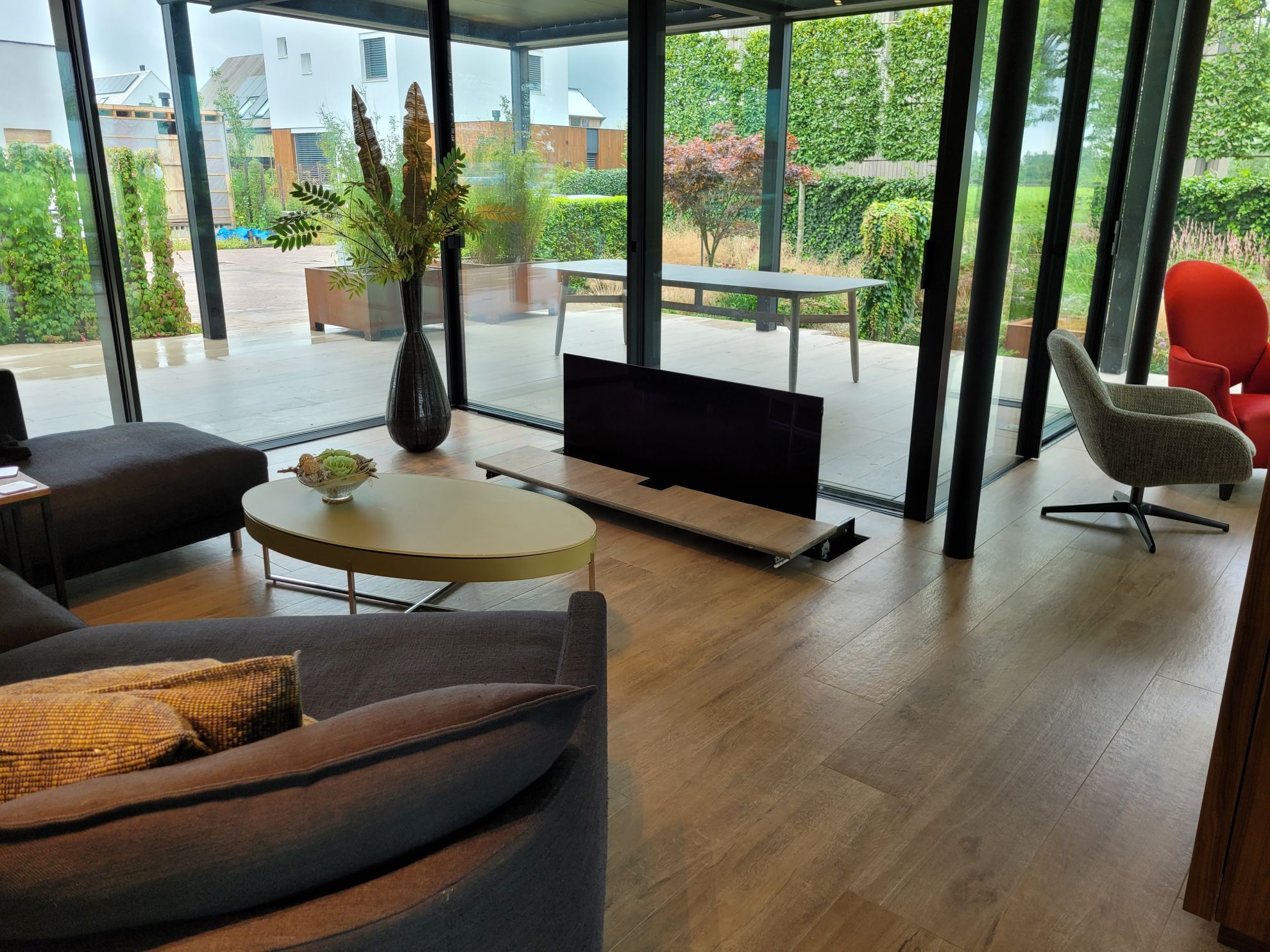 The TV lift is seamlessly integrated into the floor and partially incorporated into the low, specially designed window sill. When the television is not in use, it disappears completely from view, leaving the interior sleek and tidy. At the touch of a button, the TV rises smoothly to the ideal viewing height.